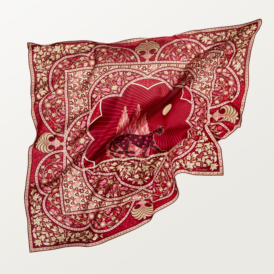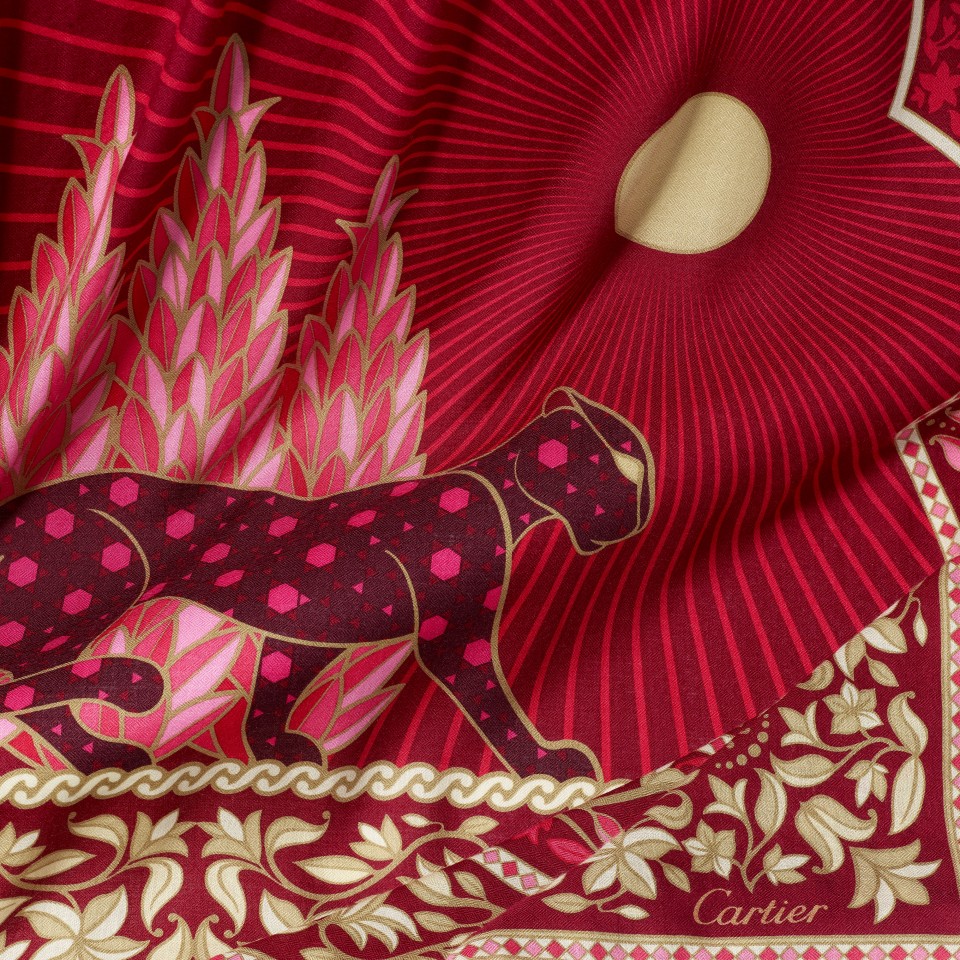 Panthère Arabesques red cashmere and silk shawl. Dimensions: 140 x 140 cm.